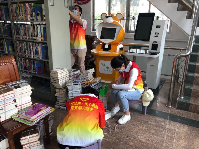 活动当天,志愿者们积极协助馆内工作人员细心地对进馆读者进行信息登记,测量体温,指引如何参与活动、图书整理、贴标分类等工作。