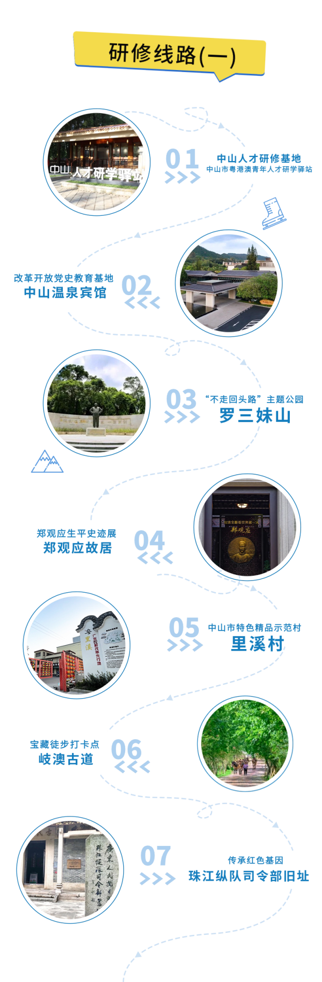 中山人才研修基地由中共中山市委组织部授牌命名,以中山市粤港澳青年人才研学驿站为起点,联动中山温泉宾馆、罗三妹山“不走回头路”主题公园、“广东小岗村”里溪村等爱国教育阵地,形成独具特色的人才研修路线,打造激励广大青年人才爱党报国、敬业奉献、服务人民的线下“活”教材,引导粤港澳大湾区人才深入了解国情、省情、市情。