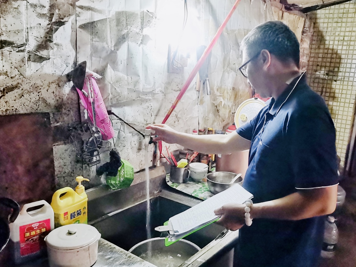 中山公用水务板芙分公司党支部在板芙镇范围内开展特殊困难对象居民用水安全隐患排查工作,通过拉网式入户走访了镇内11个村居,重点排查了镇内的特困人员、低保家庭、独居老人等104户特殊困难家庭,让居民用水放心又安心。