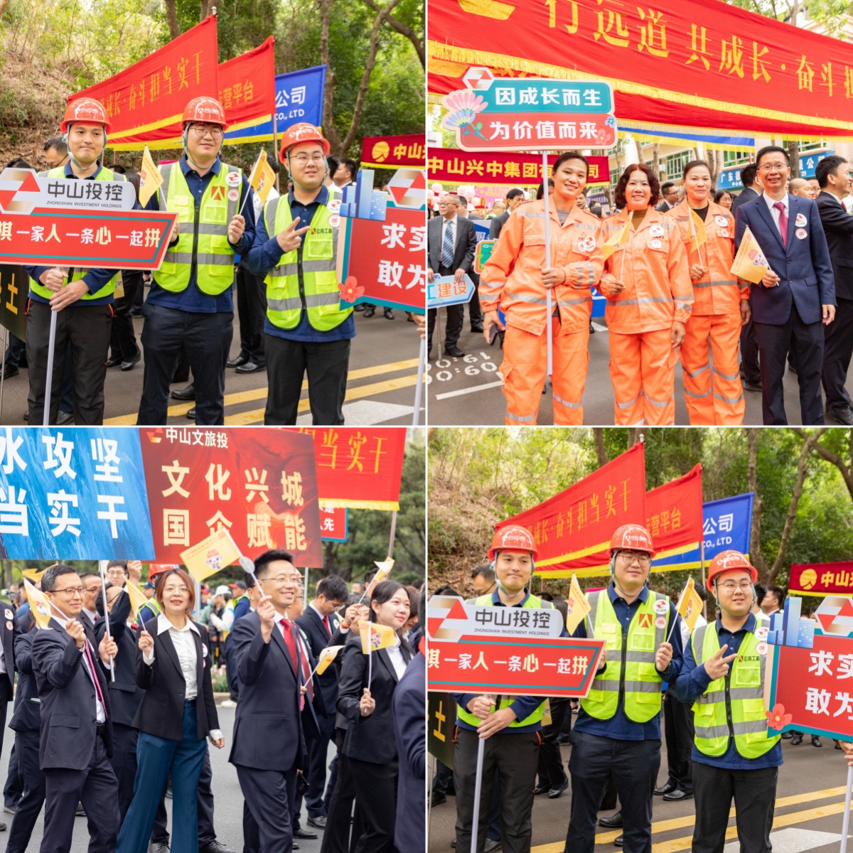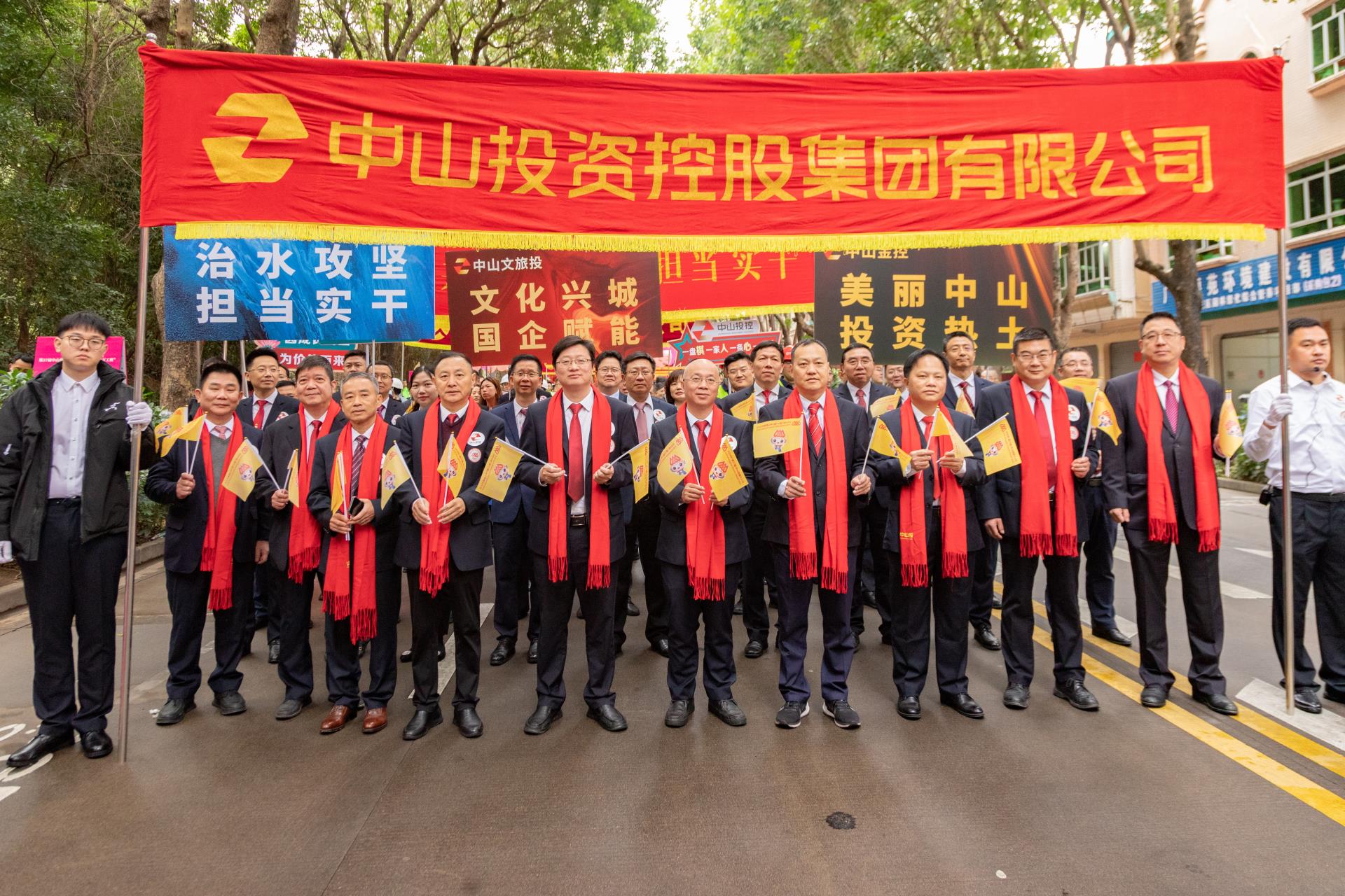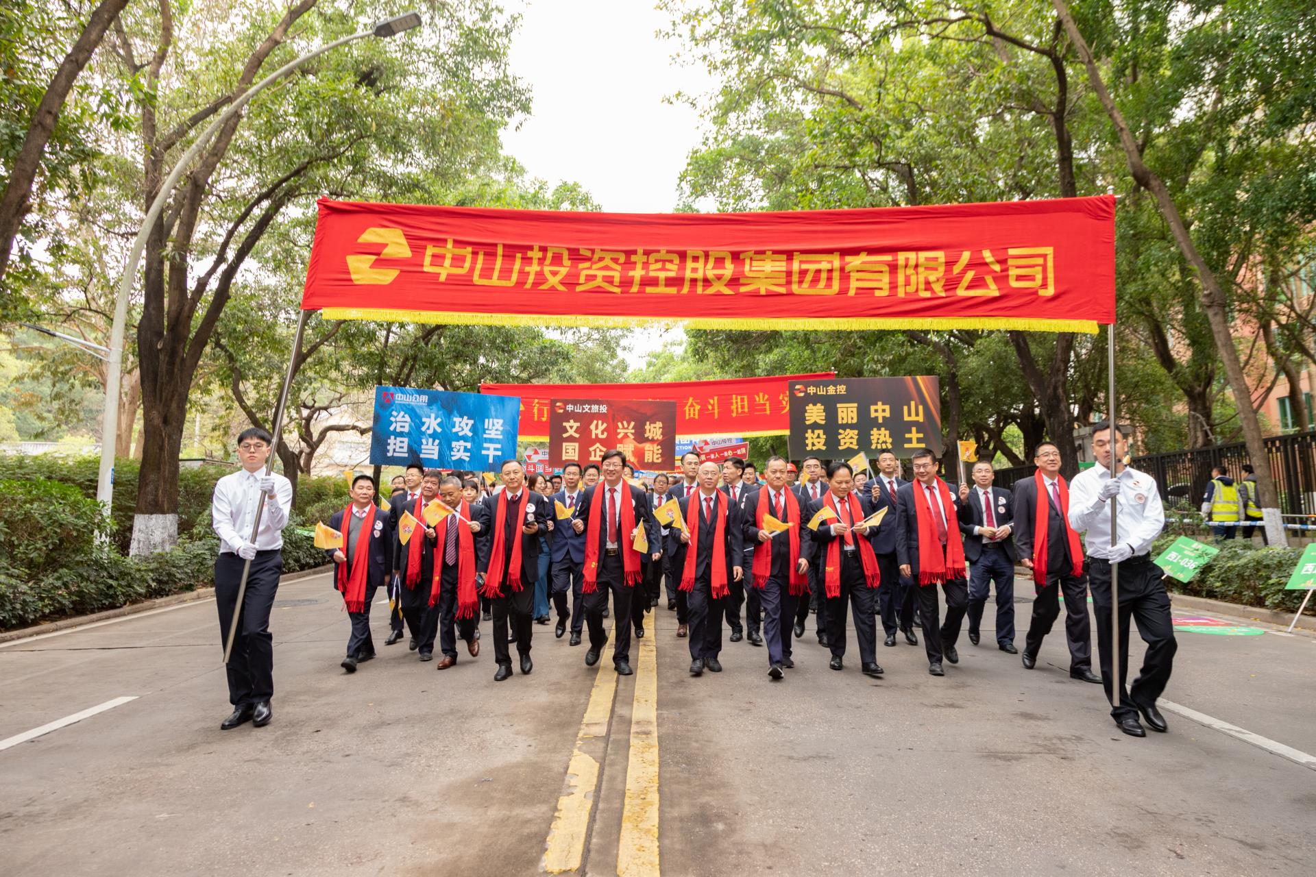 方阵前方,旗手高举着“中山投资控股集团有限公司”红底金字横幅,“美丽中山投资热土” “文化兴城 国企赋能” “治水攻坚 担当实干” 的三块牌匾紧随其后,展示了服务中山发展大局的投控主业方向。