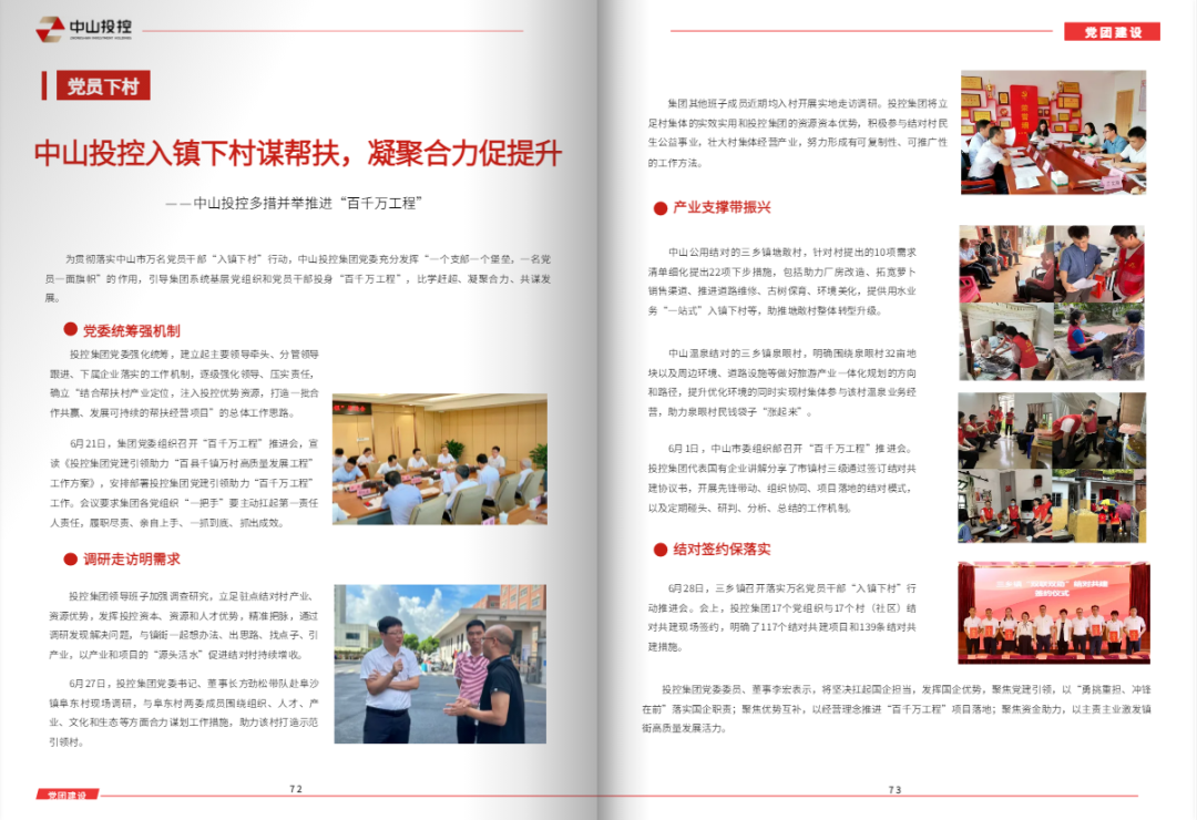 本期内刊的“党团建设”栏目内,放眼“百千万工程”的田野上,投控集团党委与乡镇同频共振、联帮并行,谱奏乡村振兴之曲,构筑幸福富民之梦;守护在廉政治企的防线前,中山投控党委开展纪律教育月活动、纪委开展系列教育讲学活动,厚植清廉文化,为集团干部职工注入“廉能量”“廉动力”;齐聚在青春团委的旗帜下,投控青年突击队扎根一线,以行动响亮作答,用青春书写华章,争当时代先锋。
