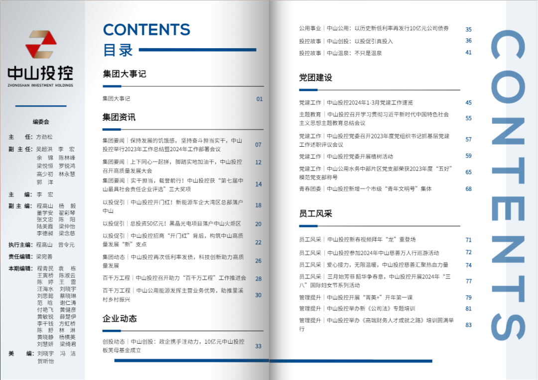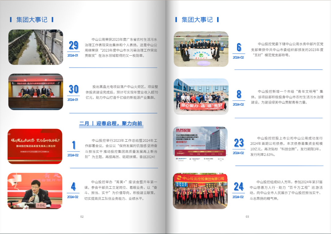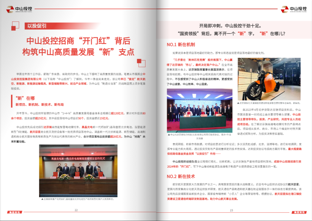 “集团资讯”栏目送上中山投控一季度亮点多多的“成绩单”——开启招商引资“开门红”,成功招引5个、总投资近35亿元的优质高新产业项目落地中山,培育新质生产力;汇聚直接融资“金活水”,累计发行4期、共25亿元公司债券,不断刷新利率纪录;发出谋篇布局“动员令”,抓早抓实部署集团年度工作、高质量发展、百千万工程工作,为集团2024年发展新篇作序。