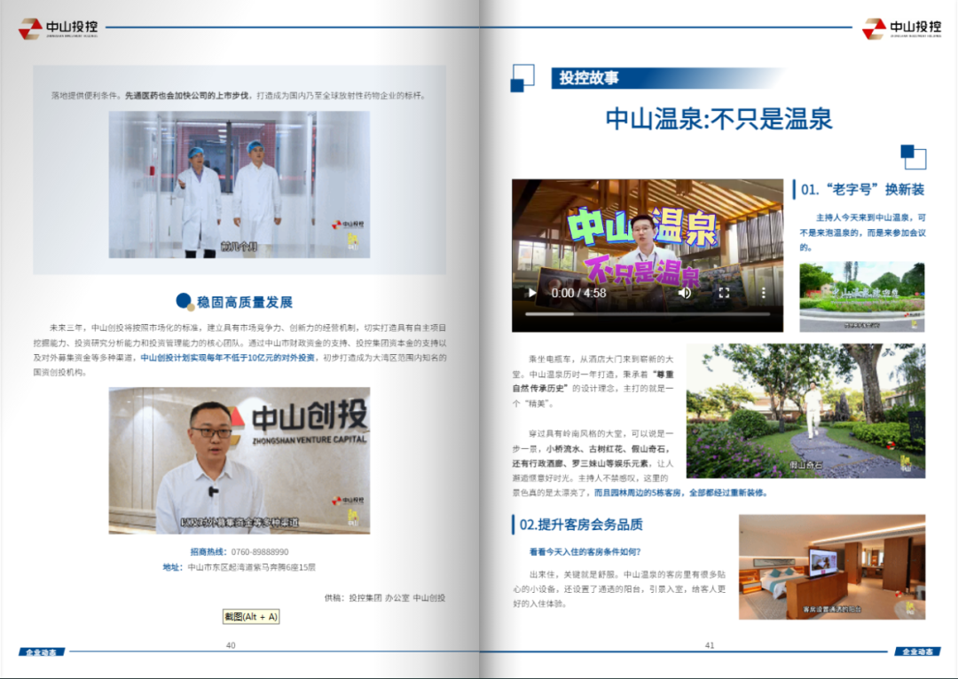 本期“企业动态”栏目特别收录了两则“投控故事”系列视频,开启全新“视”界,一路记录、一路分享企业创新发展的动人篇章,带您领略不一样的中山温泉、探访中山创投的高科技“朋友圈”,讲好投控故事,传响投控声音。