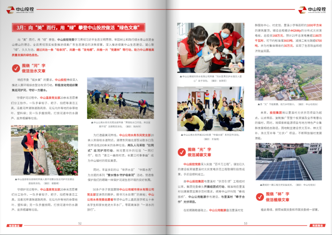 在“党团建设”栏目,聚焦呈现投控集团有声有色的党建成果——增添发展“红色动能”,主题教育再深入,基层述职再抓实,引领集团高质量发展再提速;助力建设“绿美中山”,推进共治一条“母亲河”、共建一栋“发电楼”、共植一片“公益林”;擦亮党建“金字招牌”,集团新增市级“青年文明号”集体,公用水务下属党支部再添“五好”模范称号,尽显战斗堡垒和先锋模范作用。