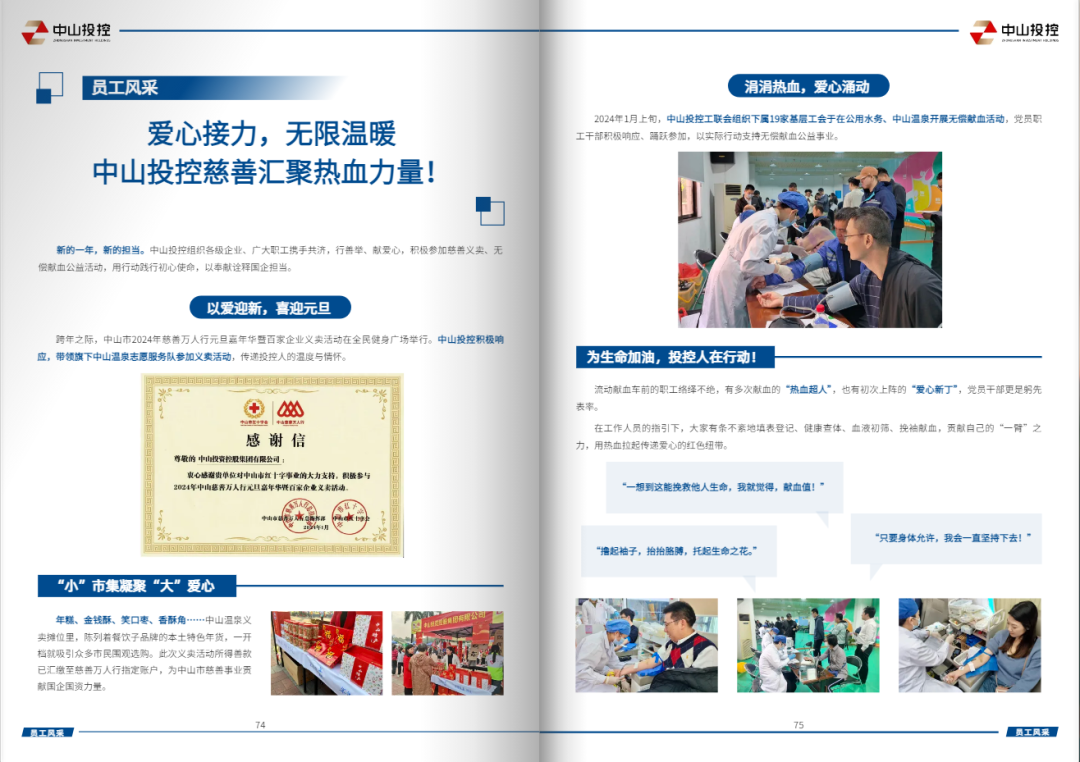 来到“员工风采”栏目,我们看到了多面多彩的投控人——有活力满满的投控人,带着喜庆的拜年视频“龙”重登场,迎着灿烂的春光展现巾帼风采;有乐善好施的投控人,在万人行方阵中昂首阔步,以爱心义卖、献血接力,用奉献诠释国企担当;还有好学笃行的投控人,踊跃参加“菁英”开年第一课、《公司法》专题培训、高端财务人才培训,大踏步“行远道”,与集团“共成长”。