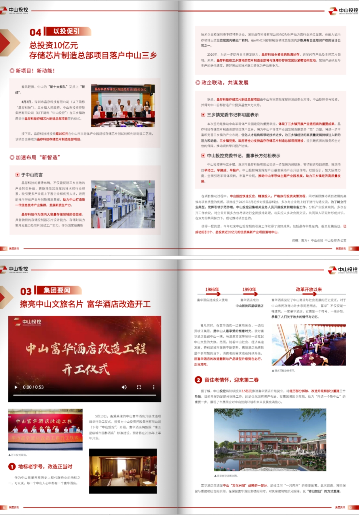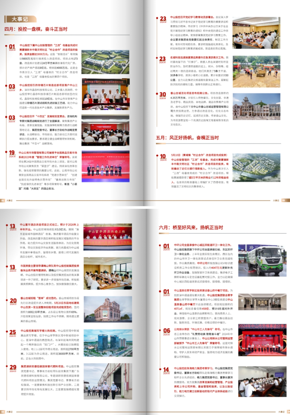 定格签约现场,捕捉到以10亿投资牵引存储芯片制作总部项目落户中山三乡,以及以3000万注资黄圃镇“村企合作”项目加速推进的奋斗之美;定格开工仪式,捕捉到留住“乡愁”老情怀的富华酒店改造升级的担当之美;定格防汛一线,累计清理隧道27条和重点道路222条、巡查排水管道超3.4万公里和河涌35条的实干之美……本期“集团资讯”栏目,为我们呈现了集团紧跟市委“深中六个一体化”风向标,在夯实过往基础之上,再发力的新征程和新业绩。