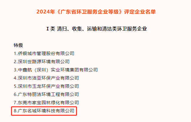近日,广东省环境卫生协会发布2024年《广东省环卫服务企业等级》评定企业名单,在55家企业中,广东名城环境科技有限公司(以下简称“名城科技”)与广州侨银、深圳世路源等8家企业被评选为清扫、收集、运输和清洁类环卫服务特级企业。这一殊荣不仅是对名城科技在环卫服务领域辛勤耕耘的肯定,也是对公司在城市环境管理方面的专业能力和服务水平的认可。