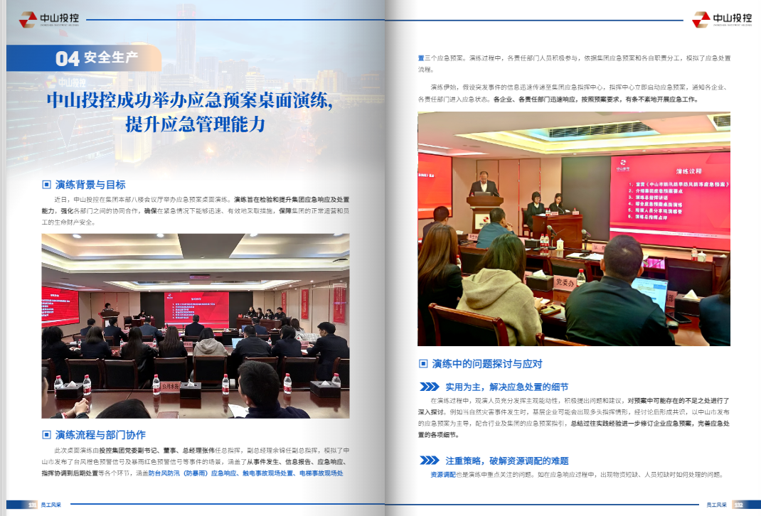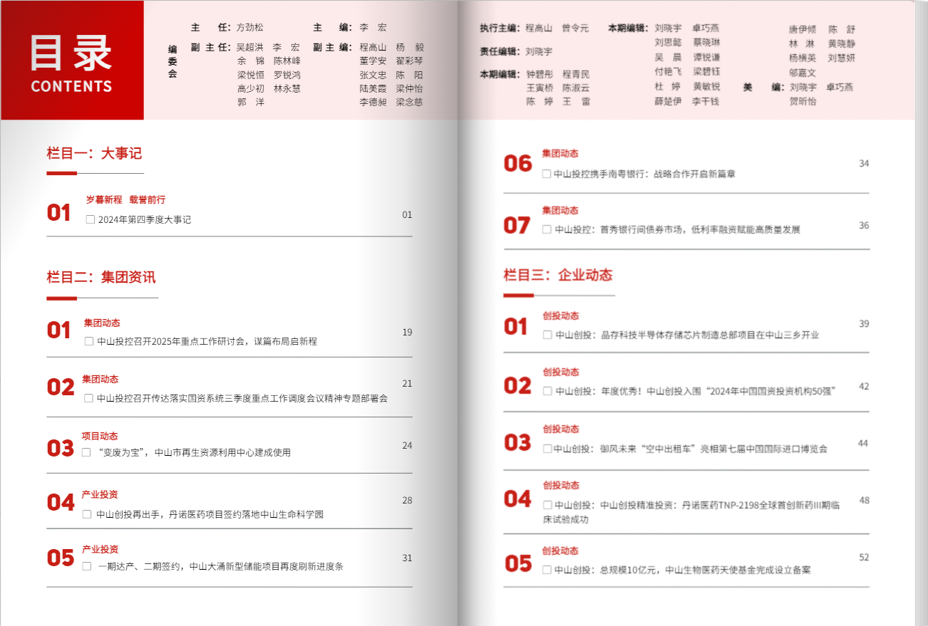 在“集团资讯”里,聚焦中山投控的发展动态。2025年重点工作研讨会谋篇布局,开启新程;专题部署会确保国资系统精神落实。再生资源利用中心 “变废为宝”,展现环保成效;丹诺医药项目签约、泓慧二期储能项目推进,凸显产业活力;与南粤银行战略合作、首秀债券市场,体现金融创新。集团在各个领域积极进取,不断前行。集团全体成员将继续努力,扎实做好各项工作,在高质量发展的道路上稳步迈进。