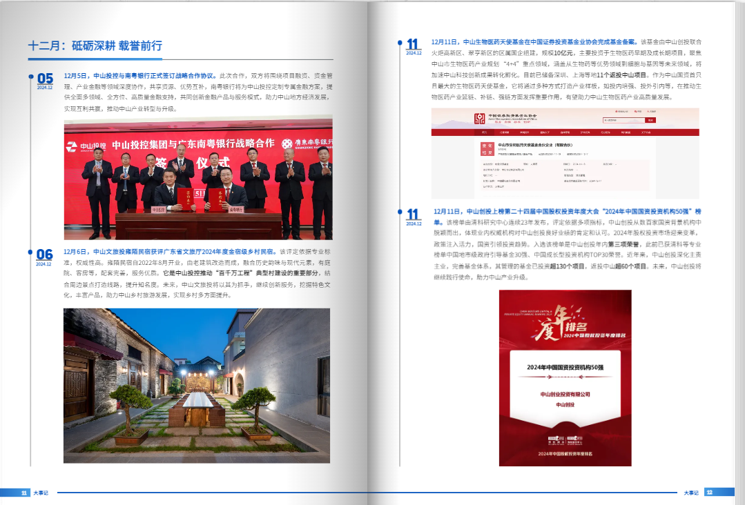 在 “集团大事记” 里,时间记录中山投控发展轨迹。第四季度,投控人齐心协力,各领域成果显著。企业载誉前行,基金成功设立,项目建成投产,酒店康养塑造新特色,公用事业收获新成效,“百千万助力” 扎实推进。每项行动、每份付出皆为发展动力。未来,投控人将以更坚定信念、更昂扬斗志,在产业投资、文化兴城、服务民生之路上笃行不怠,续写篇章。