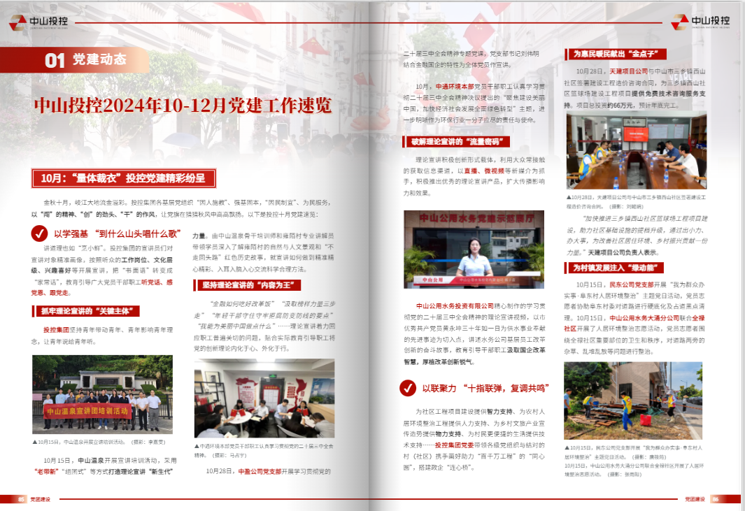 在“党建动态”栏目里,投控集团党建工作亮点纷呈。中山金控党总支荣获省级奖项,为党建创新添彩。全面助力“百千万工程”,党建引领与乡村振兴紧密结合。从农房风貌改造到产业培育,党员带头实干,助力乡村增 “颜”提 “质”。党建与业务深度融合,贯穿治企兴企全程,为集团高质量发展筑牢根基,投控党员勇做时代先锋。
